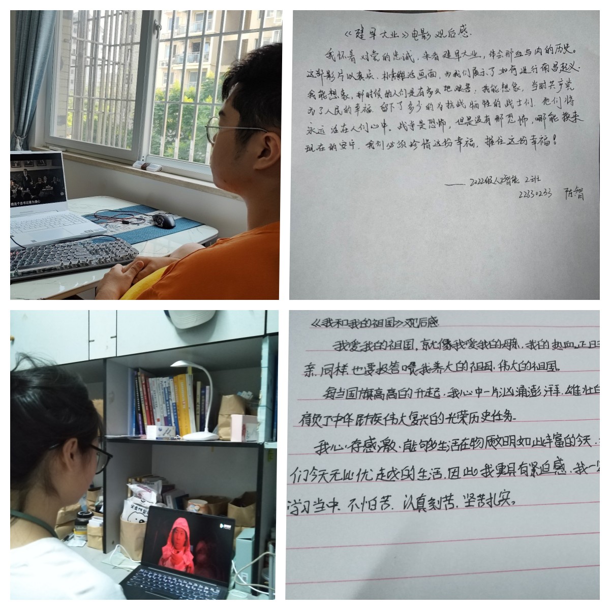 学子们自发地观看红色爱国题材电影,如《我和我的祖国》、《建国大业》、《建党伟业》、《长津湖》、《智取威虎山》等。在精彩的影片中,学子们铭记历史,缅怀先烈,执手中之笔,抒心中豪情,写下了自己观影后感想与体会,将爱国赤忱注入一笔一划中,祝愿祖国繁荣昌盛。