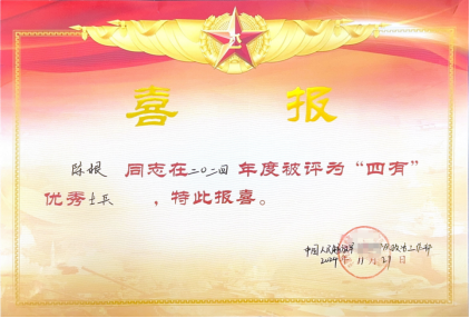 近日,学校收到中国人民解放军某部寄来的“四有”优秀士兵喜报。我校健康食品系2023届毕业生陈根,因在部队表现突出,获2024年度有灵魂、有本事、有血性、有品德--“四有”优秀士兵荣誉。