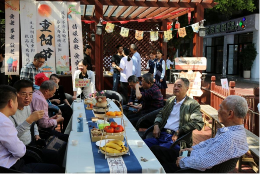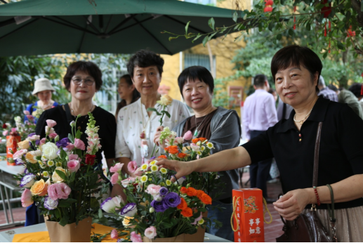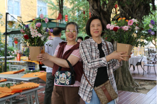 “杏林书厢”旁的榕树下,老同志们两两搭档,亲手体验创意插花。在花艺师的悉心指点下,大家巧手翻飞,将秋日的绚美定格于花篮之中,以花传情,共赏重阳雅趣。