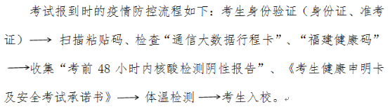 考生入场时,所持的“福建健康码”须为绿码,核酸检测阴性报告须为考前48小时内。考前14天做好自我健康监测,入场时如实进行健康申报,申报内容包括:考前21日内是否从境外返回,考前14日内是否有国内疫情高中风险区域及所在县(市、区)旅居史、是否有与入境人员(不含已解除健康管理)接触史、是否与新冠肺炎确诊病例或疑似病例或已发现无症状感染者有接触史、是否出现发热或疑似症状及共同居住家庭成员中有以上情况。