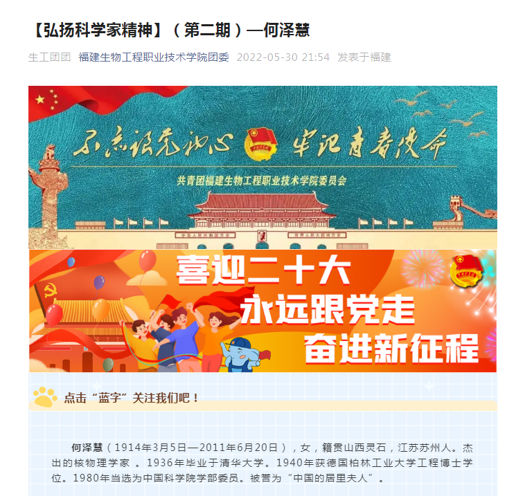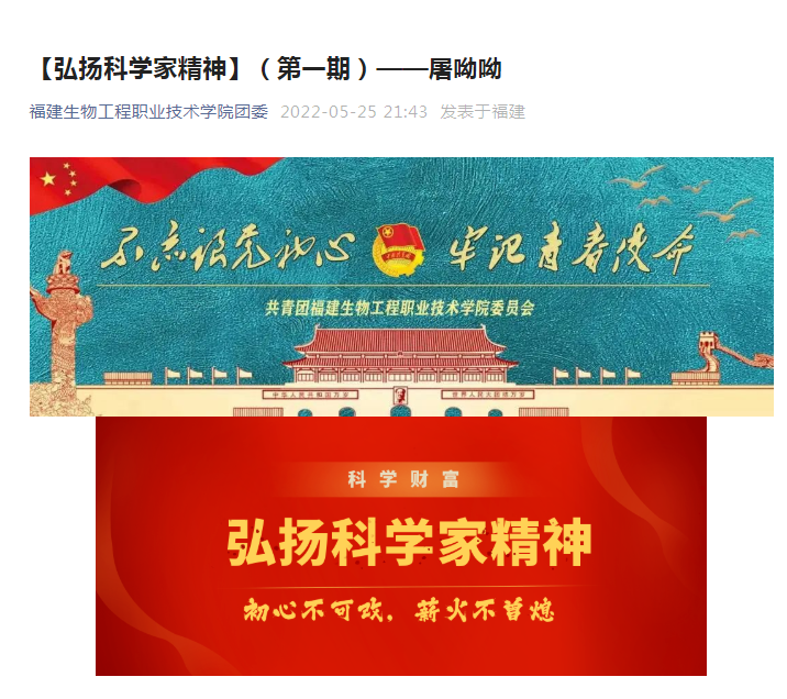 校团委在微信公众号上发表系列文章,集中宣传科学家胸怀祖国、甘于奉献的高尚情怀,大力弘扬爱国精神和创新精神,大力培育青少年尊崇科学的人生价值观,激发青少年热衷科学探索的兴趣,培养青少年投身于实现高水平科技自立自强的远大志向。