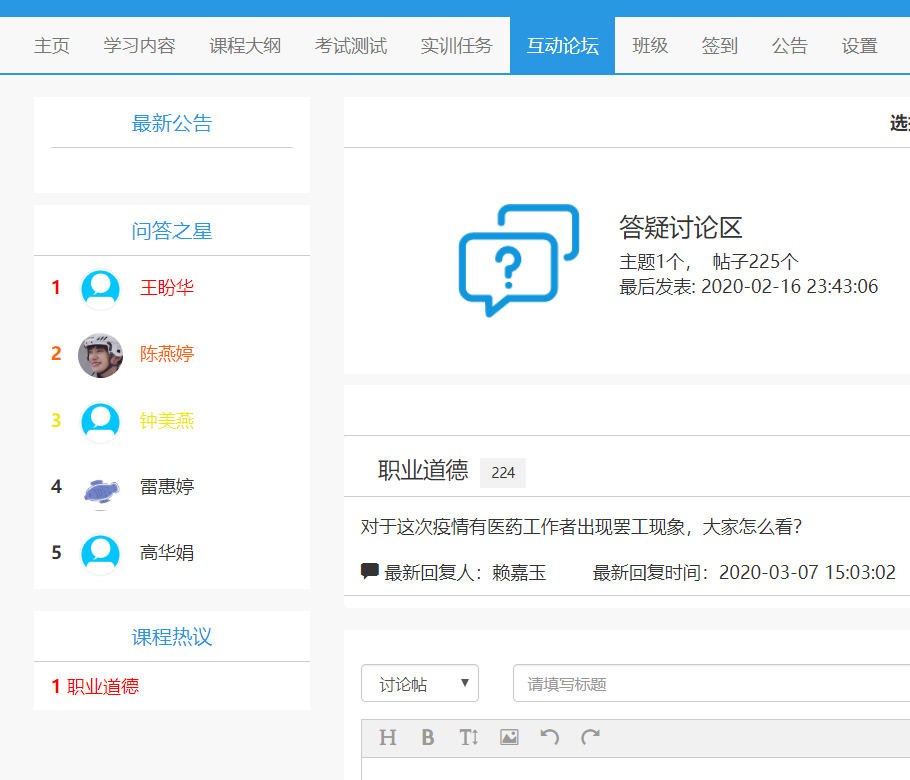 为应对网络问题,大多数老师提前发布签到。课上,针对在线教学的特点,为了让学生跟着老师同步思考,大家想方设法激发学生学习积极性,增加互动环节,测验,并发布主题讨论,在确保课堂严肃性的同时提升趣味性,老师们的课堂各具特色。
