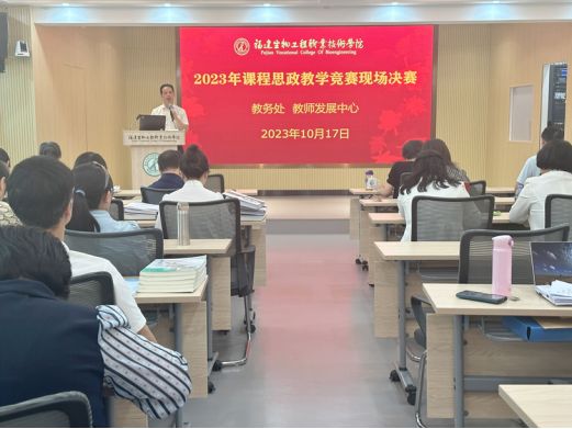 10月17日,我校在2号楼七楼学术报告厅室举办了2023年课程思政教学竞赛现场决赛。学校副校长吴昌标、福建中医药大学许克祥研究员、福建卫生职业技术学院朱扶蓉教授和我校督导室邓利群副教授出席,各教学单位领导、教研室主任和教师代表近60多人参加了观摩学习。