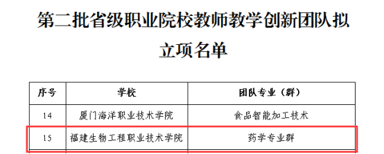 近日,省教育厅公布了第二批职业院校教师教学团队评选结果,我校药学专业群教学创新团队成功入选立项名单。