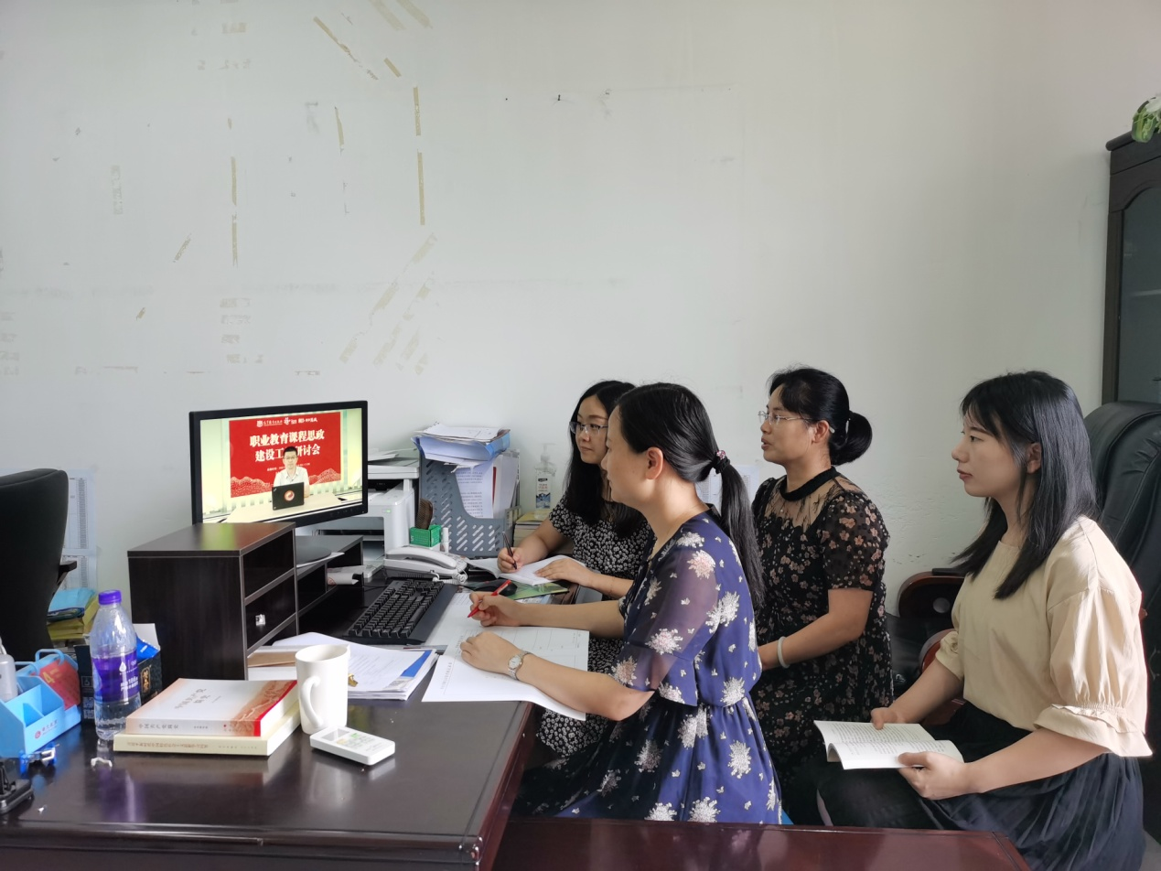 6月29日下午,由智慧职教网、新华网强强联手组织召开线上 的职业教育课程思政建设工作研讨会,我校组织了已立项的2020年度校级“课程思政”示范课的教师团队观看,各教学单位积极安排时间,教师们采用各种形式踊跃参与,共有13门课程的团队成员50余人观看了直播并进行研讨交流。