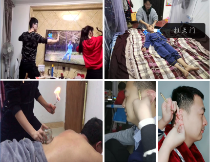 为解决“线上教学、实操不足”的缺憾,康复教研室结合健康专业特点,注重强化居家体验式健康实践操作,增强运用康复技能解决日常生活健康问题的能力。通过云课堂在线指导,以课后“为家人点穴保健”、“解决家人疼痛的拔罐疗法”、“教家人八段锦功法”、“为家中儿童开展小儿推拿”等作业形式(见下图),鼓励学生家属一同参与课后实践任务,引导学生关注家人健康,并亲身用所学技能为家人服务。