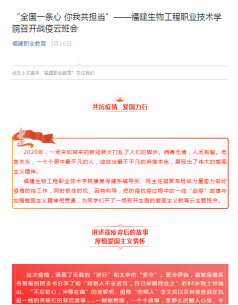 为实现职业技能和职业精神培养高度融合,康复教研室线上集体备课,将抗击疫情一线医务人员艰辛奋战的典型案例与课程思政相结合,开展医学人文和爱国主义等主题教育活动。如:邀请三位援鄂医疗队员为全系500多名师生分享了一线战“疫”心得,学校以“空中课堂 战“疫”点滴|康复保健系邀请援鄂医疗队员直播分享最美逆行故事”为题进行报道,引发广大师生热烈反响。组织各班级将防疫抗疫过程中的一线“战疫”故事与加强爱国主义精神相贯通,为同学们开展别开生面的爱国主义教育云班会,福建省教育厅“福建职业教育”微信公众号以“‘全国一条心 你我共担当’——8040威尼斯召开战疫云班会”为题进行了报道。