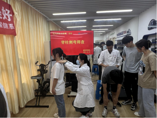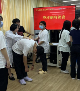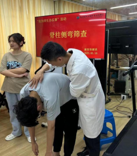 5月16日,我系康复教研室教师党员在康复专业群生产性实训基地(产创融合中心)为全系2022级学生开展脊柱侧弯免费筛查活动,康复学社社员现场观摩实践。