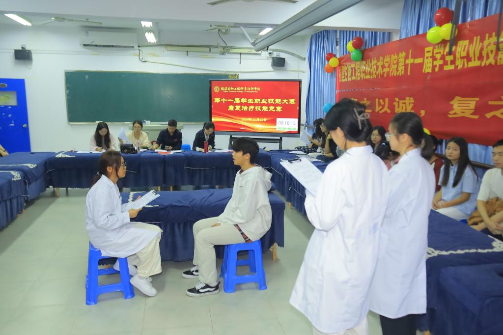 11月12日,康复保健系在铜盘校区春华33号楼310实训室举办学校第十一届学生职业技能大赛康复治疗技能竞赛,康复教研室4名专任教师担任评委,40名学生代表参加现场观摩,并同步线上直播。