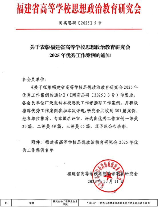 近日,福建省高等学校思想政治教育研究会公布了2025年优秀工作案例评选情况,我系杨珺老师的《“11445”一站式心理健康管理体系助力学生自我成长案例》获优秀工作案例二等奖。该案例立足学生心理健康需求,构建一站式育人模式,有效助力学生自我成长,充分展现了我系在思想政治教育与心理健康教育融合领域的实践创新与成效。