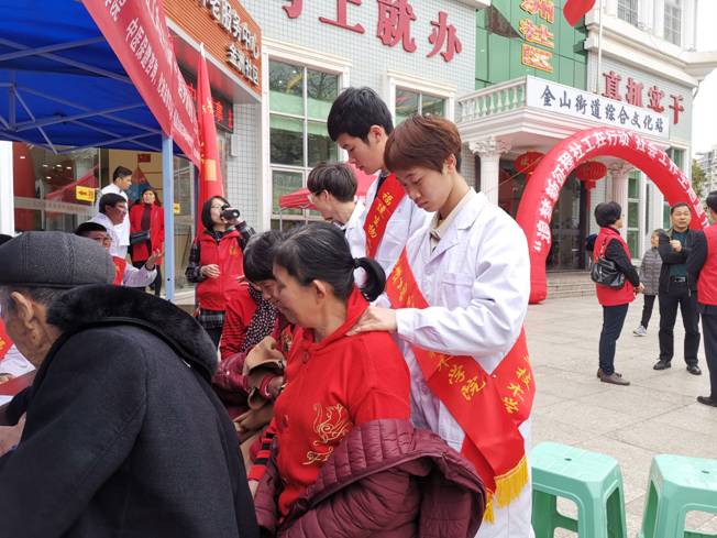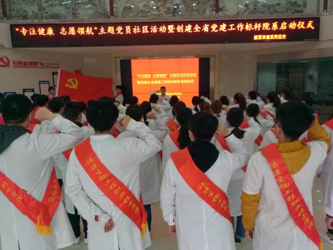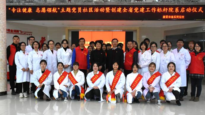 面朝党旗,春暖花开,红色格调,活力彰显。“志愿汇”APP签到集合,康复保健系党总支、教工党支部、学生党支部整合行动,全省党建工作标杆院系党总支、样板党支部创建在党员志愿服务现场启动,校领导关淑玲带头以普通党员志愿者的身份融入活动,并为启动创建标杆院系党总支、样板党支部鼓劲加油;18名师生党员面向党旗重温入党誓词,学生入党积极分子和团员现场观摩,感受庄严的洗礼。由10名执业医师、心理咨询师和康复治疗、中医养生保健、化妆品等专业构成的“双师”型党员教师分组带领学生,一边为社区居民提供健康咨询、预防保健、康复理疗等健康专业服务,一边为学生传授专业服务要点,“医、养、健、教”融合服务的方式倍受居民青睐,也深受学生喜爱。系党支部与社区党支部负责人借助志愿服务契机,现场沟通,探讨在校企合作基础上拓展党建合作的途径...这一项项,汇聚成一个主题“专注健康,志愿领航”。此次活动得到了社区居民和社区党组织负责人的好评,也让志愿者体验到了组织的活力与奉献的感动。