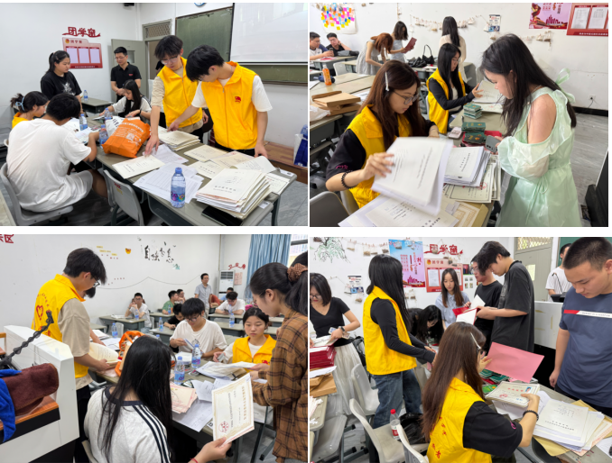 为保证毕业证书准确发放,志愿者们严格按照流程要求,认真核对、分类整理每一位毕业生的毕业证书及相关材料。大家一丝不苟,保证每份证书信息准确无误、封装规范,他们以高度的责任心,准确、有序地将毕业证书递送到每一位毕业生手中。