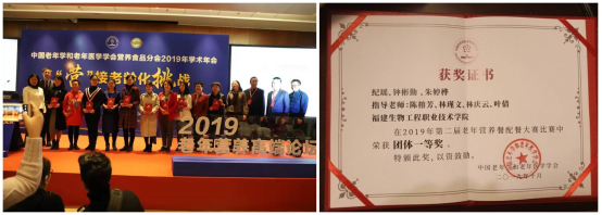 此外,我院18级健康管理专业纪瑶、钟彬勤、朱婷桦3位同学在健康管理教学团队陈榕芳、林瑾文、林庆云、叶倩4位老师指导下,参加了学会组织的2019年第二届老年营养餐配餐大赛比赛,并于11月3日在大会上荣获中国老年学与老年医学学会第二届老年营养配餐比赛的团体一等奖。