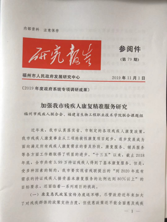 近日,由我校康复保健系康复保健团队与福州市残疾人联合组成的联合课题组共同完成的2019年政府系统专项调研成果《加强我市残疾人康复精准服务研究》在福州市人民政府研究发展中心的研究报告中发布。该调研成果依托2019年福州市人民政府重点调研课题《福州市城乡肢体残疾人康复需求及精准施策的专题研究》,经过将近一年的时间,以福州城乡代表性区域(鼓楼、台江、晋安、闽侯)的肢体残疾人为调研对象,结合全国情况,采取面对面访谈填写问卷调研方式,了解目前我国肢体残疾人康复服务需求情况,并提出面向残疾人的康复需求配套补助、精准帮扶的对策建议。