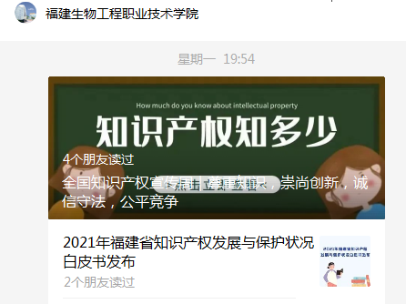 四、多渠道宣传,提高知识产权保护意识。我校微信公众号转载国家知识产权局和福建市场监督管理局有关知识产权保护资讯内容,并在学校宣传栏宣传保护知识产权,通过在全校范围线上线下宣传,增强全校尊重和保护知识产权的意识,助力知识产权强国建设。
