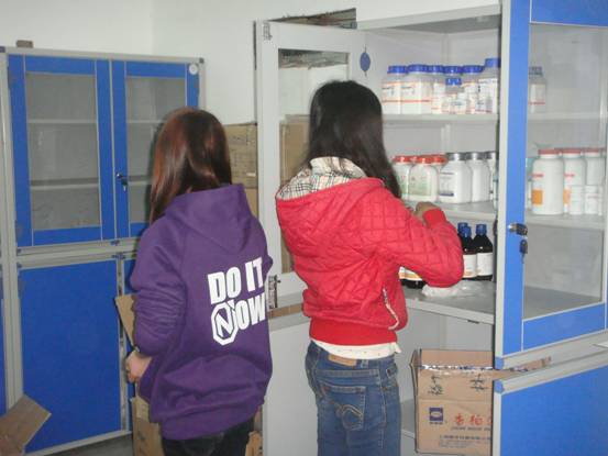 小组照片 同学们在整理药品 打扫储物柜 清洗实验仪器