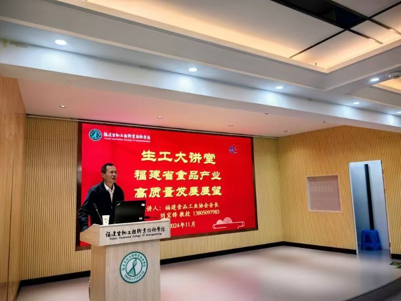 2024年11月19日下午,学校科技处联合健康食品系在洪山校区学术报告厅举办生工大讲堂活动。本次活动的主旨是通过深化产教融合和科教融汇,推动职业教育高质量发展,服务经济社会发展,增强职业教育服务能力。活动得到福建省食品工业协会大力支持,邀请福建食品工业协会会长刘宜锋教授作“福建省食品产业高质量发展展望”专题讲座,100余名师生到场参加。