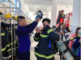 (党员师生们在消防员的帮助下穿戴消防救援员专业设备,体验消防战士抢险救灾过程的艰辛)