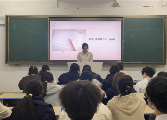 随后,学生会各部门负责人依次汇报了近期工作进展及本学期工作计划。从组织校园学术竞赛到筹备毕业典礼,从开展社会实践活动到加强学风建设,各部门的汇报内容丰富、条理清晰,展现了团学组织蓬勃的工作活力。