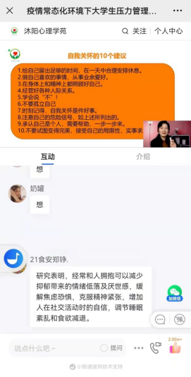 林秀琴老师从“压力是什么、压力从何来、如何管理压力以及如何调节情绪”等四个方面展开,详细讲述了压力和情绪的基本知识,分享了许多情绪调节的实用技巧,并进行了现场答疑互动。讲座内容丰富,通俗易懂,对于同学们适应当下封闭式校园生活、化解疫情之下的心理困扰具有很强的理论性、实操性和指导性。