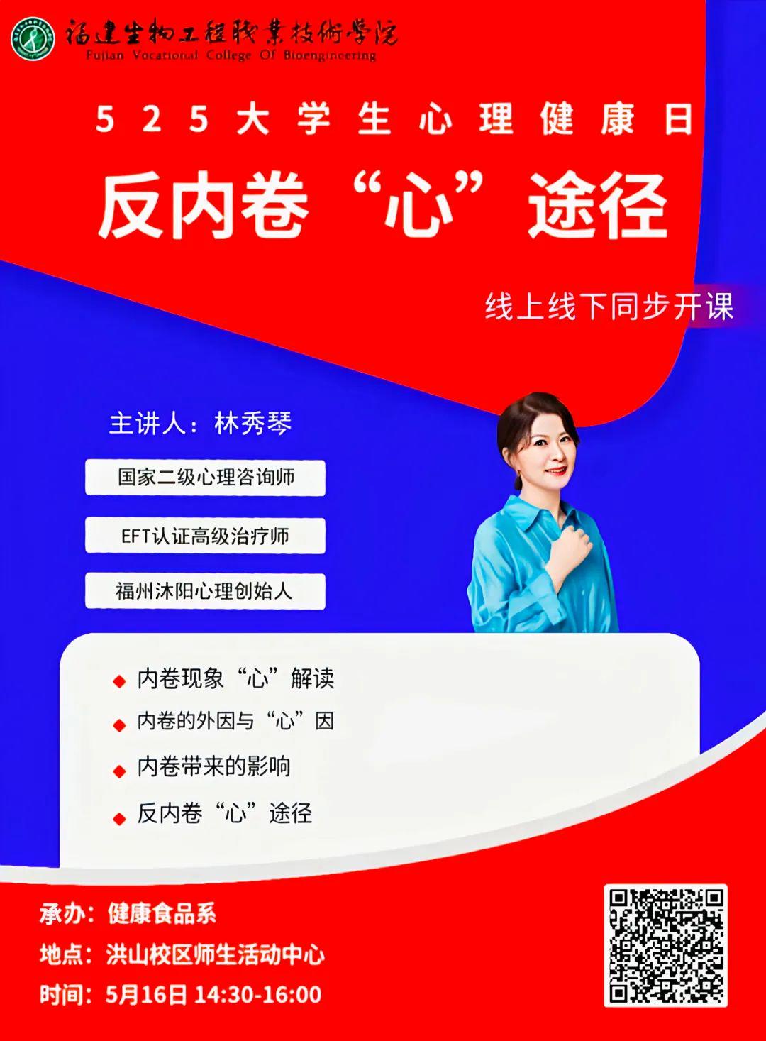 2023年5月16日,我系在洪山校区师生活动中心举办“反内卷‘心’途径”心理健康讲座,特邀国家二级心理咨询师、福州沐阳心理创始人林秀琴老师开讲。300余名学生通过线上线下方式参与。