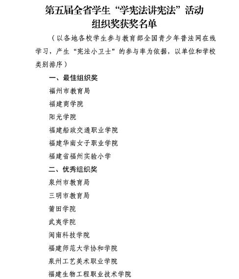 日前,福建省教育厅、福建省司法厅公布了第五届福建省学生“学宪法讲宪法”活动获奖名单,我校荣获优秀组织奖。